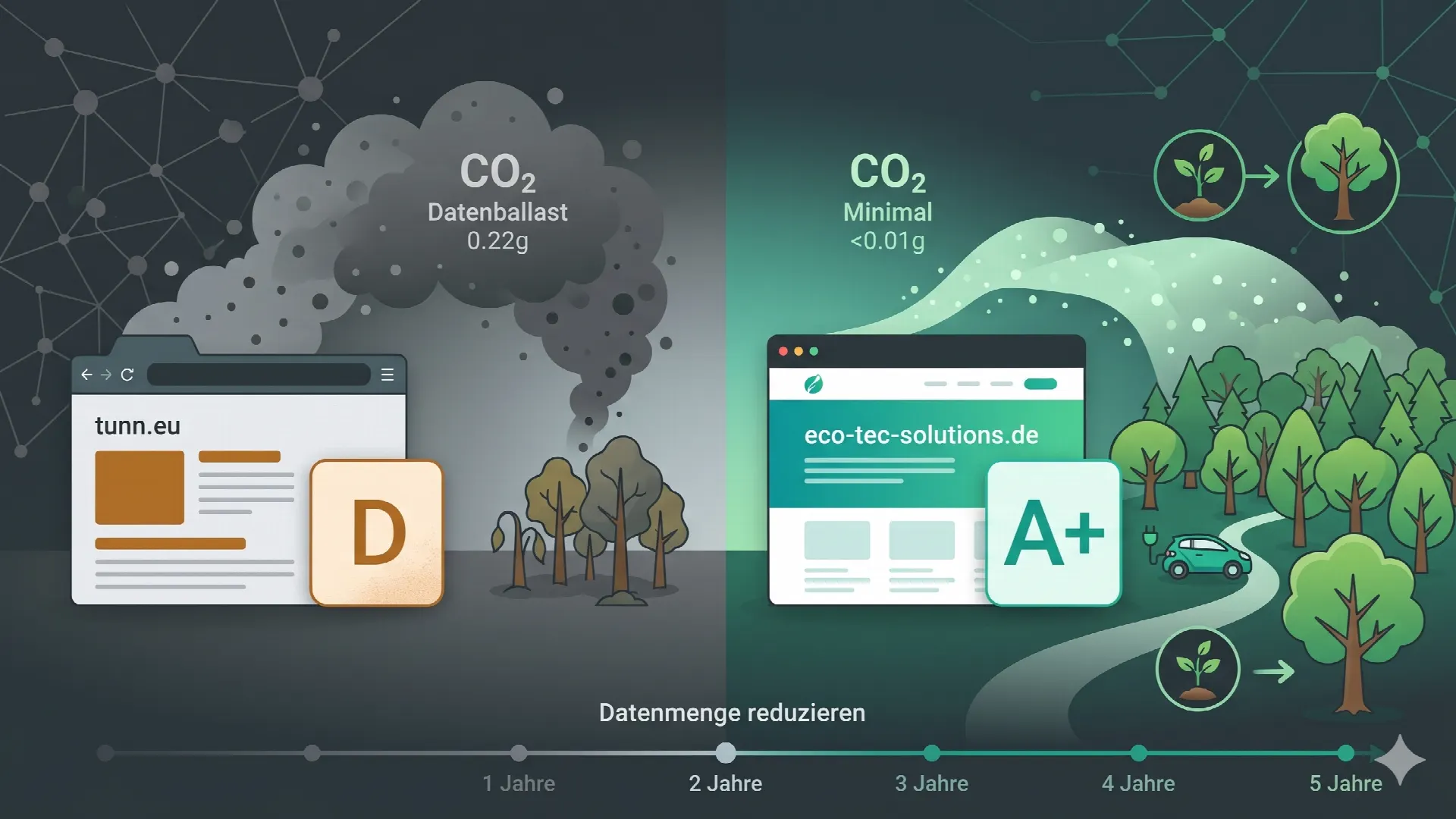 Schlanker Code als Klimaschutz: Wie eco-tec-solutions 95% CO2 pro Klick einspart. Ein Praxisbericht über digitale Effizienz und Nachhaltigkeit.