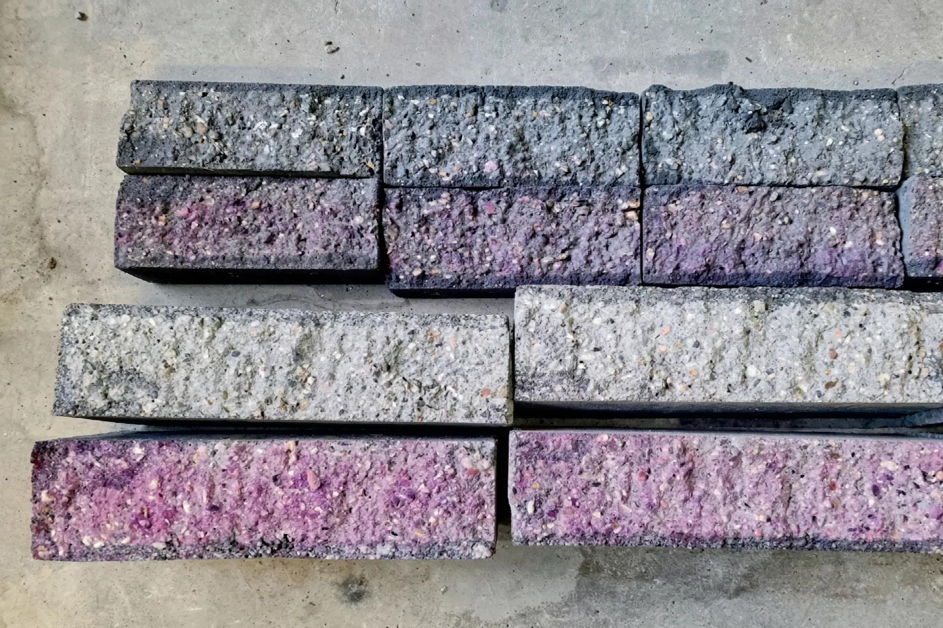 Getestet wurden verschiedene CO₂-Konzentrationen: 5.000 ppm über 24 und 48 Stunden sowie 10.000 und 20.000 ppm über 24 Stunden. Die bestehenden Rezepturen blieben unverändert, und es kam ein marktüblicher Zement zum Einsatz. Zur Überprüfung der Karbonatisierungstiefe wurden die gehärteten Steine anschließend gebrochen und mit Phenolphthalein benetzt – ein Indikator, der nicht-karbonatisierte Bereiche violett färbt.